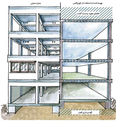 - افزایش فضای مفید (قابلیت اجرای دهانه تا ۱۸ متر بدون اجرای ستون)