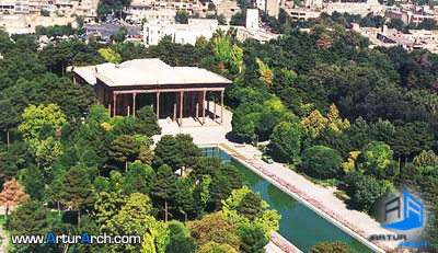 باغ چهلستون را با شکل فعلی شاهعباس کبیر طرح انداخته و در وسط آن عمارتی به شکل کلاه فرنگی (ابعاد کاخ ۳۶*۵۷ متر و ارتفاع آن ۱۲ متر) با اطاقهای کوچک در اطراف آن احداث کرده است که با شروع سلطنت شاهعباس دوم عمارت مزبور توسعه داده شد و تالارها و ایوانهایی بر آن افزودند.