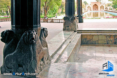 هر یک از ستونهای تالار از یک تنه درخت چنار ساخته شده و روی آن قشر نازکی از تخته رنگ شده وجود دارد که سابقا با آیینه و شیشههای رنگین پوشش شده بوده است. تمام دیوارها از آیینههای قدی و شیشههای رنگی و نقاشیهای زیبا تزیین شده و همه درها و پنجرهها از نوع منبت و خاتم بوده است. استخر مقابل عمارت به طول ۱۱۰ متر و عرض ۱۶ متر اکنون هم طراوت و زیبایی خاصی به این کاخ میدهد و جهش آب در حوض میان تالار از دهان چهار شیری که در چهار گوشه حوض قرار دارند و فوارههای سنگی مسیر جوی کوچک اطراف کاخ، صفای مخصوصی به این قصر باشکوه داده است.