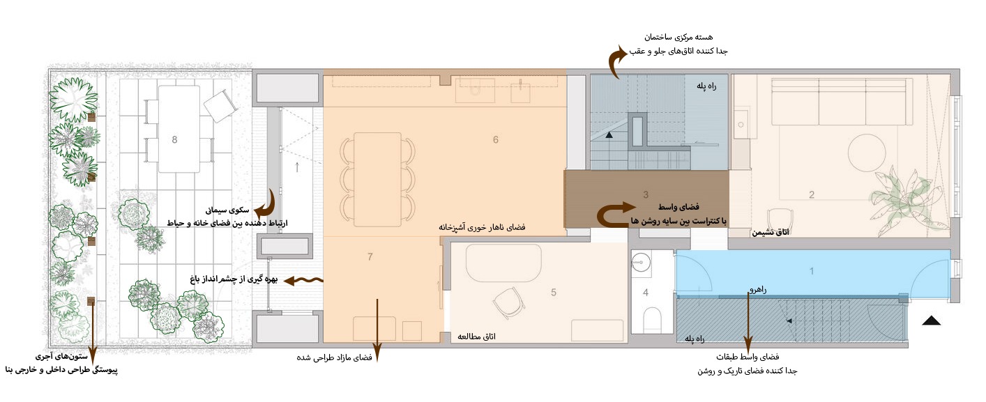 پلان زیر تحلیلی از نقشه ساختمان را در یک نگاه ملاحظه خواهید کرد. ارتباط درون و بیرون، چشم‌انداز باغ و نشیمن‌گاه سیمانی کنار پنجره، تداخل مصالح اکسپوز و کار شده کنار هم با ظرافتی معمارانه و همچنین بازی با کنتراست رنگی سایه روشن‌ها از شاخصه‌های بارز این خانه مسکونی است.