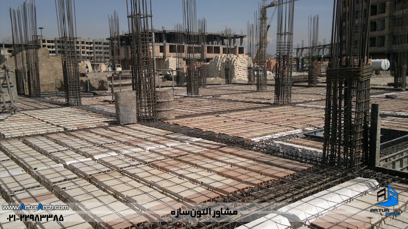 پس از کف سازی آهن گذاری تیرهای دهانه ها انجام می شود و آهن هایی که به صورت عمودی در تیرها قرار دارند آهن ریشه برای ستونهای بالا هستند.