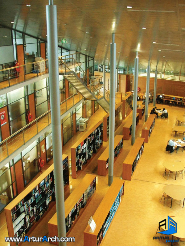 وقتی حجم کتابخانه را از نزدیک دیدم، متوجه نشدم که با یک ساختمان عملکردی مهم سروکار دارم. حجم ساختمان در اولین مواجهه تا حدودی نامشخص است و تنها مخروط روی بام است که بهخوبی دیده میشود. ورودی کتابخانه بهصورت یک شکاف در دیواره چمن طراحی شده است. بخشی که ورودی کتابخانه را تشکیل میدهد در پلان بهصورت یک مثلث است و با چندین پله به در شیشهای ورودی ختم میشود. پلهها تمامی سطح ورودی را میپوشانند و آن را از سطح چمن اطراف جدا میکنند. سقف کتابخانه فلزی و شیبدار طراحی شده است و با راه رفتن روی سقف بهخوبی میشود شیب را احساس کرد. کل سایت کتابخانه تقریبا مستطیل شکل است که چندان قابل تشخیص نیست. راهحل خلاقانه طراحان برای گریز از یک حجم ساده و یکنواخت که لازمه فضایی عملکردی مانند کتابخانه است، در طراحی این کتابخانه بهخوبی خودش را نشان میدهد. معماری کتابخانه دلف از چند نقطهنظر شاخص و قابل توجه است. اولین نکته هماهنگی این کتابخانه با بافت اطراف است. کتابخانه با سقف شیبداری که از سطح ورودی آغاز میشود و با لایه چمن روی آن بهخوبی در بافت طبیعی قرار گرفته است. دومین نکته شاخص، عناصر سازهای خاص و منحصربهفرد این کتابخانه است که بهگونهای زیبا طراحی شده است. مهمترین این عناصر معماری مخروط فلزی است که شاخصه این کتابخانه است و باعث میشود این کتابخانه که بهخاطر طراحی خاص خودش در بافت حل شده است، نمایی ویژه داشته باشد. این مخروط خود از دو بخش بسته در قسمت پایینی و باز در نیمه بالایی تشکیل شده است و بخش بالایی آن با عناصر خطی فلزی از جمله لولهها و کابلهای فلزی طراحی شده، با دادن حالتی نیمهشفاف به این عنصر شاخص، آن را هر چه بیشتر با بافت هماهنگ کرده است. معماران با طراحی ورودی از یک جهت و نورگیری از جهت دیگر جبهه ورودی را با سایر بخشهای ساختمان کاملا متمایز و متفاوت کردهاند. این کتابخانه کار گروه طراحان مکانو (Mecanoo) است که از سال ۱۹۸۴ در شهر دلف هلند مشغول به طراحی هستند. کتابخانه دانشگاه دلف در سال ۱۹۹۷ ساخته شده و برنده جایزه ملی طراحی ساختمانهای فلزی هلند در سال ۱۹۹۸ شده است. گروه طراحان معماری مکانو در بسیاری از شهرهای بزرگ دنیا هم آثار شاخصی طراحی کردهاند. کار این گروه طراحان در کتابخانه دانشگاه دلف آمیزهای از پیشرفتهای تکنولوژیک، توجه به مقیاس انسانی و نیز بازی با احجام است.بعد از وارد شدن به کتابخانه دلف، با فضایی کاملا متفاوت با معماری بیرونی آن مواجه شدم. هر چقدر که حجم معماری بیرونی بهصورتی نامشخص در بافت قرار گرفته و بهجز نماد شاخص خود، تقریبا در بافت ناپیداست اما داخل کتابخانه با مشخصههای کامل یک کتابخانه دانشگاهی طراحی شده است. حجمی وسیع با سقفی بلند که بخشهای زیادی از آن بهصورت void طراحی شده بود. دیوارها و کف کتابخانه در هماهنگی با قفسههای چوبی با همان رنگ و بافت قرار گرفته بود و باعث میشد که حواسمراجعهکنندگان پرت نشود. درواقع معماران، بازیگوشی طراحانه خود را در طراحی این کتابخانه برای فضای بیرونی نگاه داشته بودند و فضای داخلی را تا حد ممکن ساده و کاربردی طراحی کرده بودند.