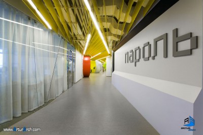 اولین دفتر اداری که توسط معماران za bor برای Yandex توسعه یافت در طبقه زیرین ساختمان مرکز تجاری Benois در سنپترزبورگ قرار دارد.