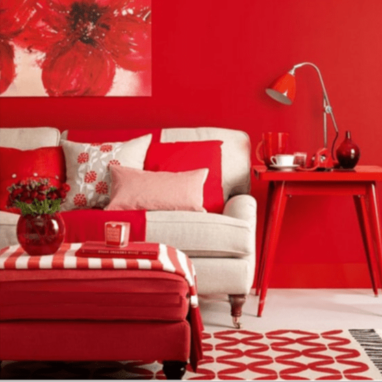 ۵- قرمز : یک رنگ انرژی دهنده و هیجان آور است که معمولا توصیه میشود در اتاق نشیمن از آن استفاده شود. البته بخاطر حالت رمانتیک و گرمی که دارد بعضا برای دکوراسیون داخلی حمام نیز بکار گرفته میشود.