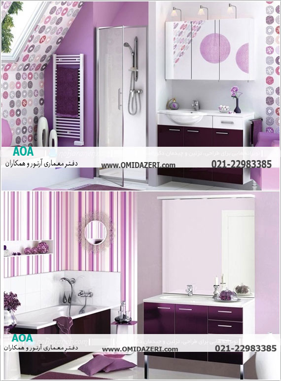 طراحی دکوراسیون داخلی حمام با رنگ بنفش و سفید