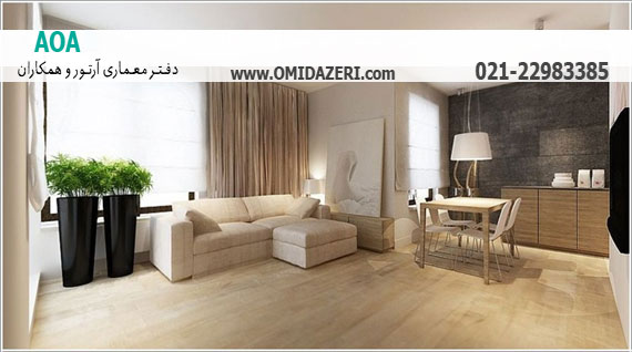 تزیین دکوراسیون اتاق نشیمن با کفپوش های چوبی کرم رنگ
