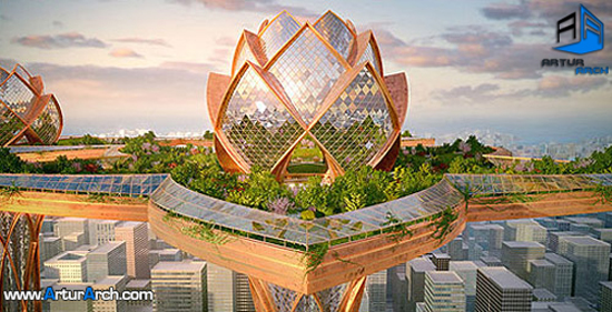 یکی از این نظرها متعلق به TsvetanToshkov معمار است که شامل یک شهر پیشرو الهام گرفته شده از نیلوفر آبی در بالای آسمانخراشهایی است که بشر با آن آشناست: «شهری در آسمان مفهومی از واحهای آرام در بالای شهر آلوده و مگا توسعهیافته است که میتوان از هیاهو، هوای آلوده و گرد و غبار روزانه به آنجا پناه برد.