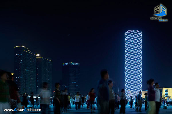 این میدان، در میانه ی قلب شهر تیانجین(Tianjin) قرار دارد، که مکانی بسیار با اهمیت است.” ما جرات کردیم تا فضایی وُید و تهی را طراحی کنیم، که هیچ مفهومی از حضور نداشت. مسیر فکری این پروژه بر مبنای ایده های شرقی بنا شده است. این برج [دارای مفهومی] شرقی[قدرتمندی] است.