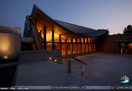 ترکیب فرم بنا به نحوی است که از تمامی بازشوهای آن میتوان قسمت دیگری از حجم را مشاهده نمود. این بنا که درزمینی ناهموار قراردارد تنها در سمت ورودی با زمین هم تراز بوده و سایر قسمتهای بنا توسط ستونهای باریک فولادی و خرپاهای چوبی بر فراز زمین قرار گرفتهاند. ترکیب فرم بنا به نحوی است که از تمام بازشوهای آن میتوان قسمت دیگری از حجم را مشاهده نمود. این بنا که در زمینی ناهموار قرار دارد تنها در سمت ورودی با زمین هم تراز بوده و سایر قسمت های بنا توسط ستونهای باریک فولادی وخرپاهای چوبی بر فراز زمین قرار گرفتهاند.