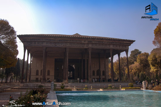 می دانیم که صفویان به منظور تقویت پایه های حکومت و سلطه شان به راهبرد بقا و استمرار آیین های پادشاهان باستان روی آوردند و خود را وارث امپراتوری ایران باستان ساختند (عالمی، همان: ۴۸) . نقشه (شهرنگ) کاخ چهلستون بازگشت به معماری پیش از اسلام را به خوبی بازتاب می دهد. زیرا قدمت چنین نقشه ای به کاخ اردشیر ساسانی در فیروزآباد بازمی گردد. (هیلن براند، ۱۳۸۰: ۴۳۴)