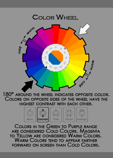 موقع بررسی خصوصیات نمود رنگ می توان هفت نوع کنتراست کشف کرد. این کنتراست ها از نظر خصوصیت, ارزش هنری, تاثیر بعدی, میانی و نمادی, منحصر به فردند و در مجموع با هم پایه و اصول رنگ بندی را تشکیل می دهند.
