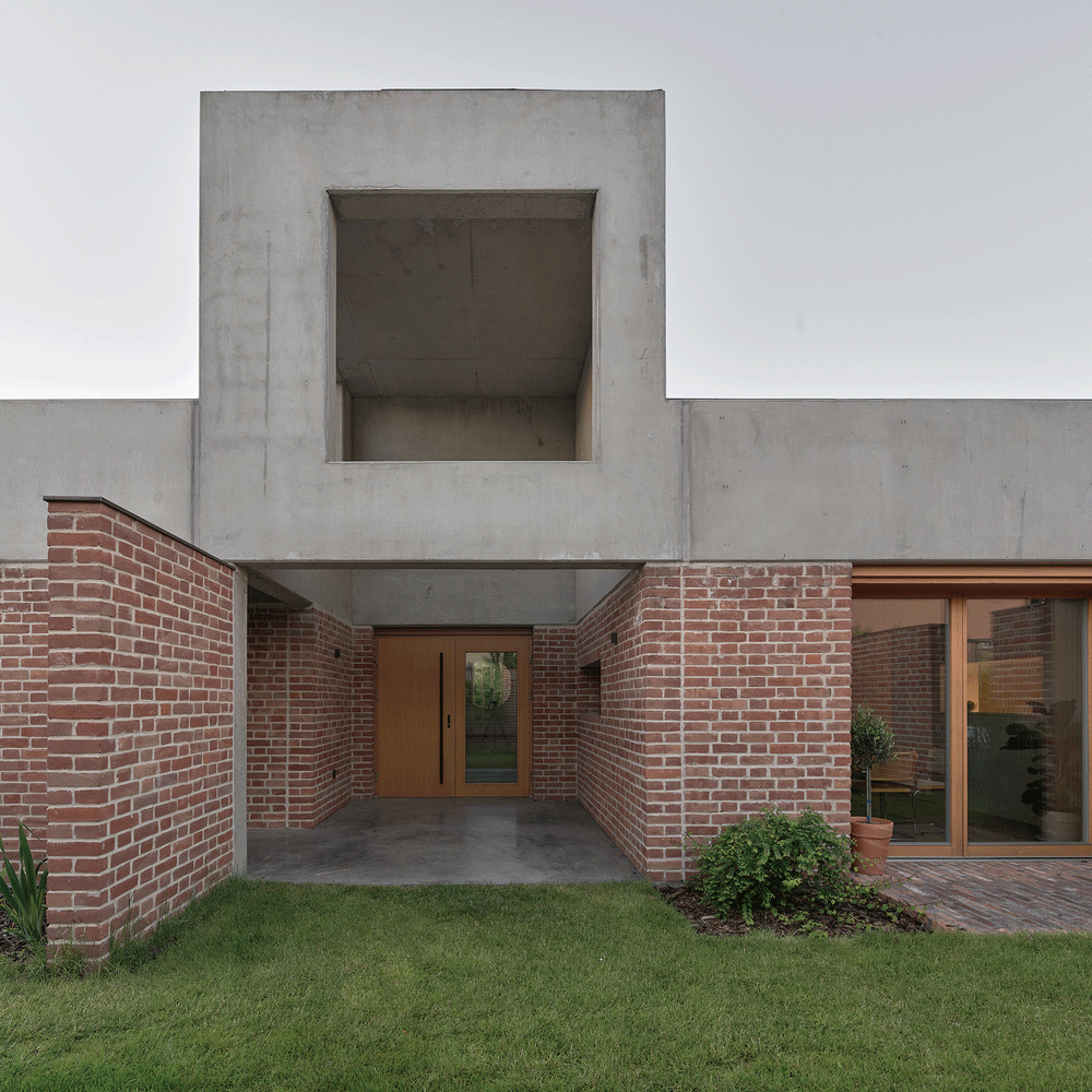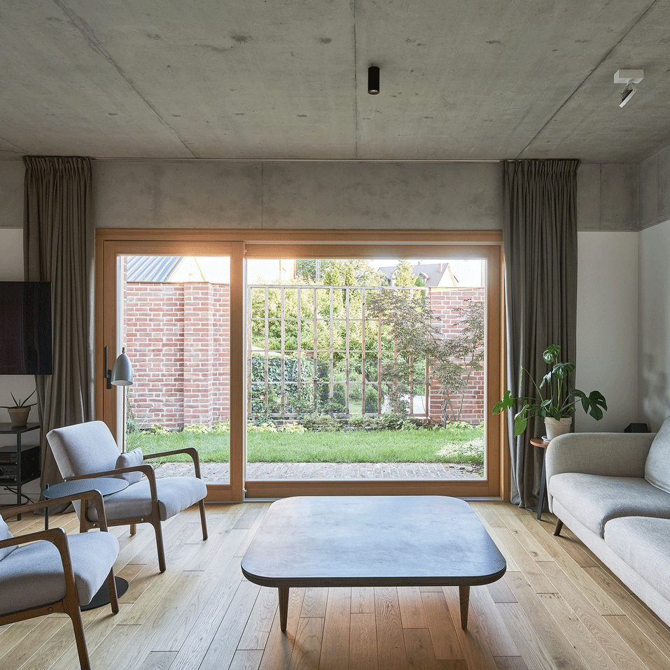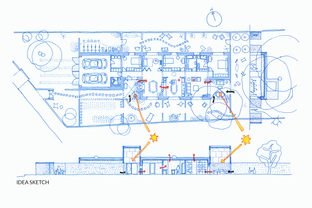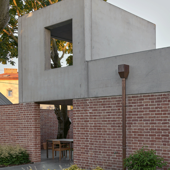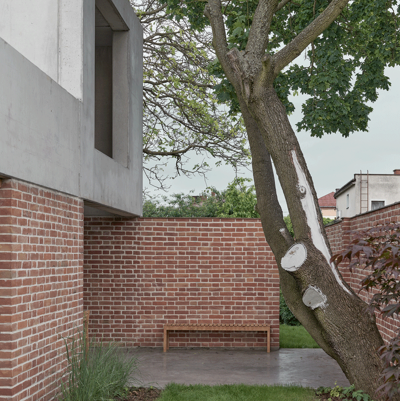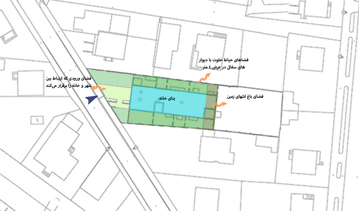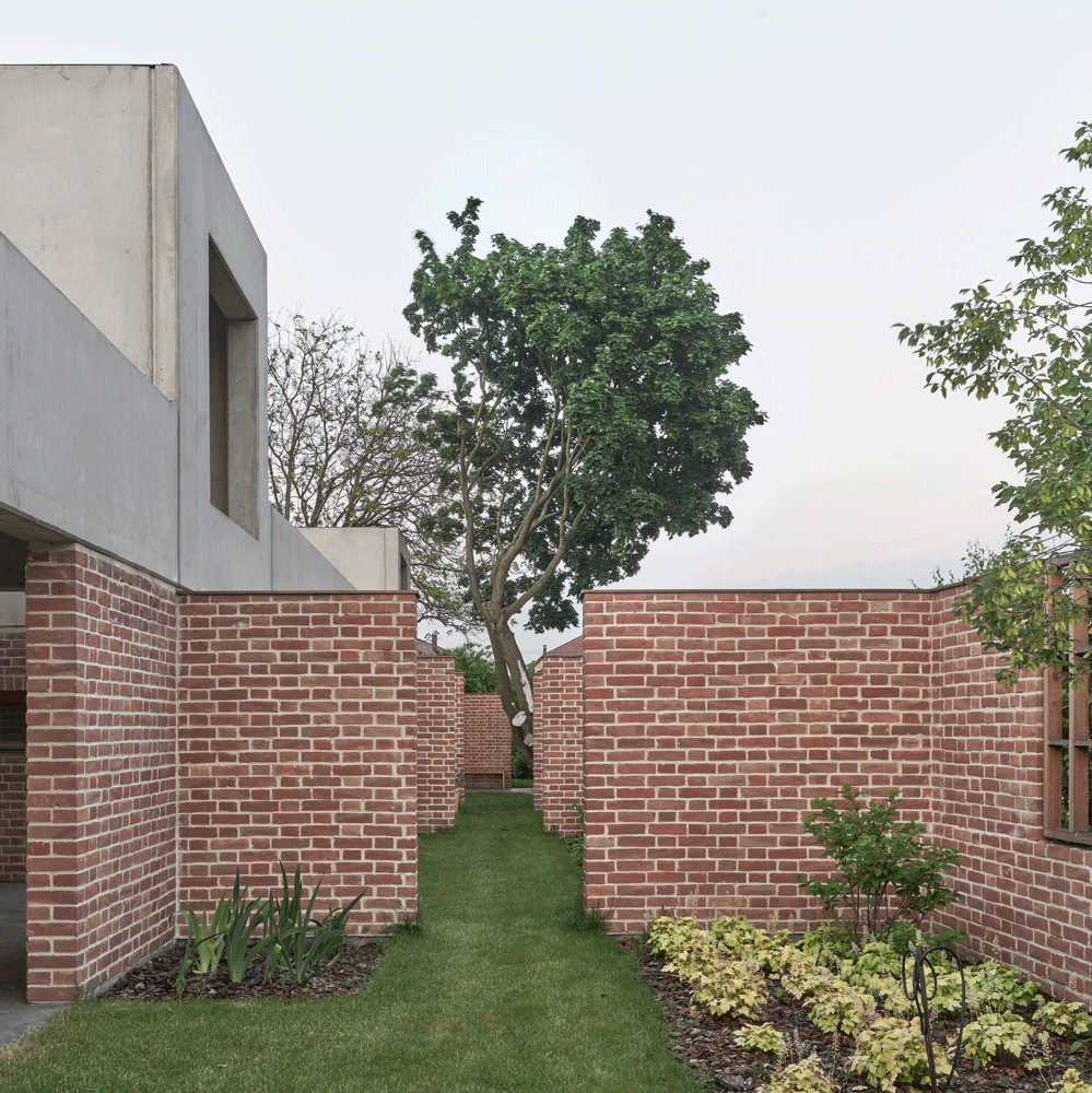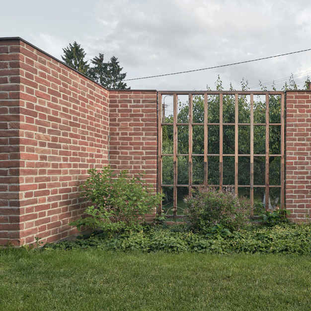 در شهر کوچک مولاوا خانهها غالبا به صورت تک خانواری بوده و به دلیل وجود بچهها در خانواده، علاقه به ساخت خانهها تا حداکثر دو طبقه هستند.این خانه نیز در زمینی شکل گرفت که دارای باغی در انتهای زمین بود. معمار و کارفما در صدد بودند تا باغ را دست نخورده باقی گذاشته و نهایت استفاده را از این بخش ببرند. پس با توجه به این فضا که تقریبا مربع شکل بوده و حاضر به دستکاری آن نبودند و طبق قانونهای ساخت و ساز منطقه، باقی فضای باقیمانده بین خانه و کل مساحت زمین دارای عرضی کمتر از ۴ متر است. برای حل این مشکل دیوارهایی که میتوانند با توجه به قوانین تا ارتفاع ۲.۲ متر بالا بیایند، از دیواره خارجی به سمت خانه جلو آمده و حیاط خلوتهای کوچکی را شکل دهند. این کار باعث میشود دالانی سبز و طلانی به فضاهای کوچکتر تقسیم شده و خرد اقلیمهای کوچکتری را تشکیل میدهد. این دیوارها با سیستم thermo-clay ساخته شدهاند.