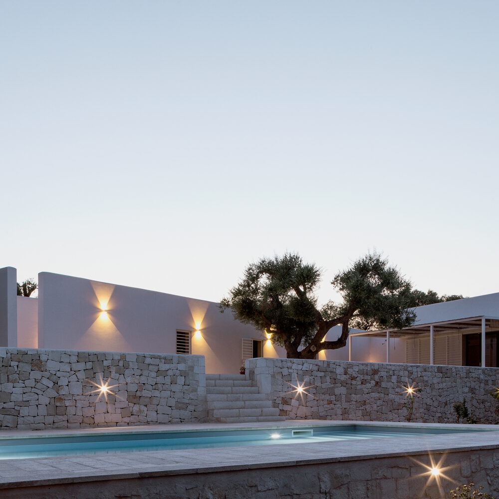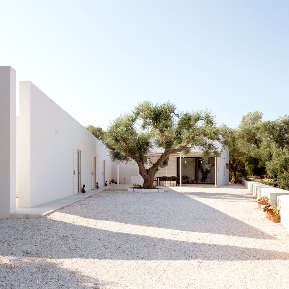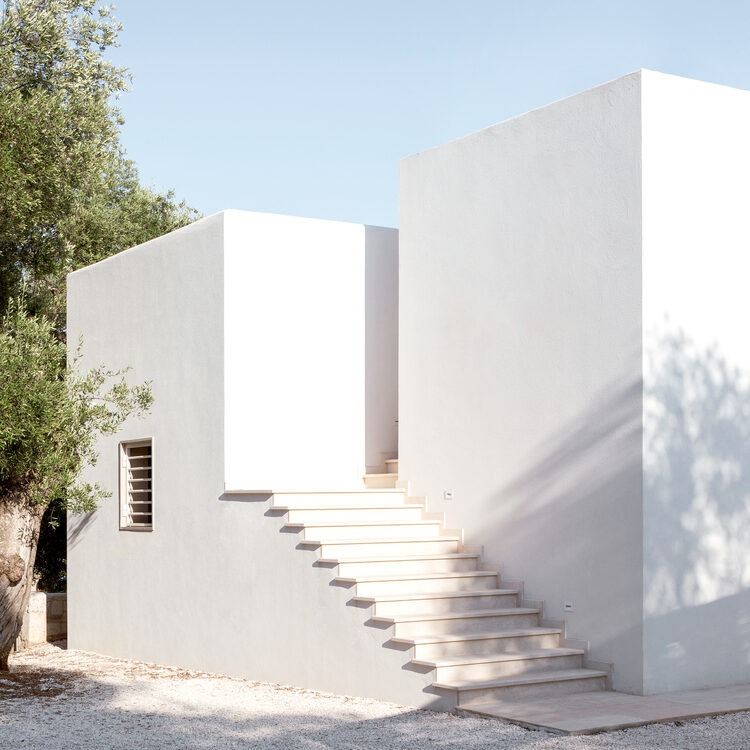حجم اصلی که مکعبی سفید بوده و متشکل از فضای نشیمن است. مکعب دیگر آن را که شامل فضاهای استراحت و اتاقهای خواب است را قطع میکند. چرخش این مکعب سفید به دلیل حفاظت از درختی کهنسال است. این درخت در مرکز فضای اصلی تراس و همچنین بنا قرار گرفته است. مصالح ساختمان از سنگی آهکی و سفید است که در میان سبز رنگی زیتونها خودنمایی میکند.
