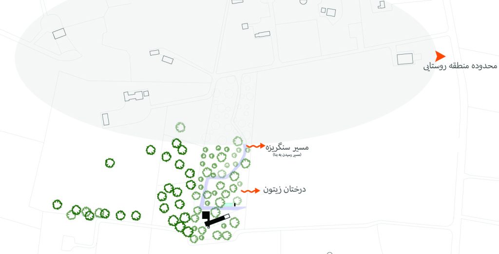 بنایی سفید رنگ در میان منظرهای بکر با درختان زیتون. درختانی با پیکرهای آبستره وانتزاعی. مانند مجسمه هایی از زمین رویده در کنار بنا. تلفیق معماری و طبیعیتی بکر با عناصری یکپارچه. بنا بر روی سکویی متشکل از دو مستطیل کشیده است که یکی از آنها با چرخشی، دیگری را قطع کرده است.