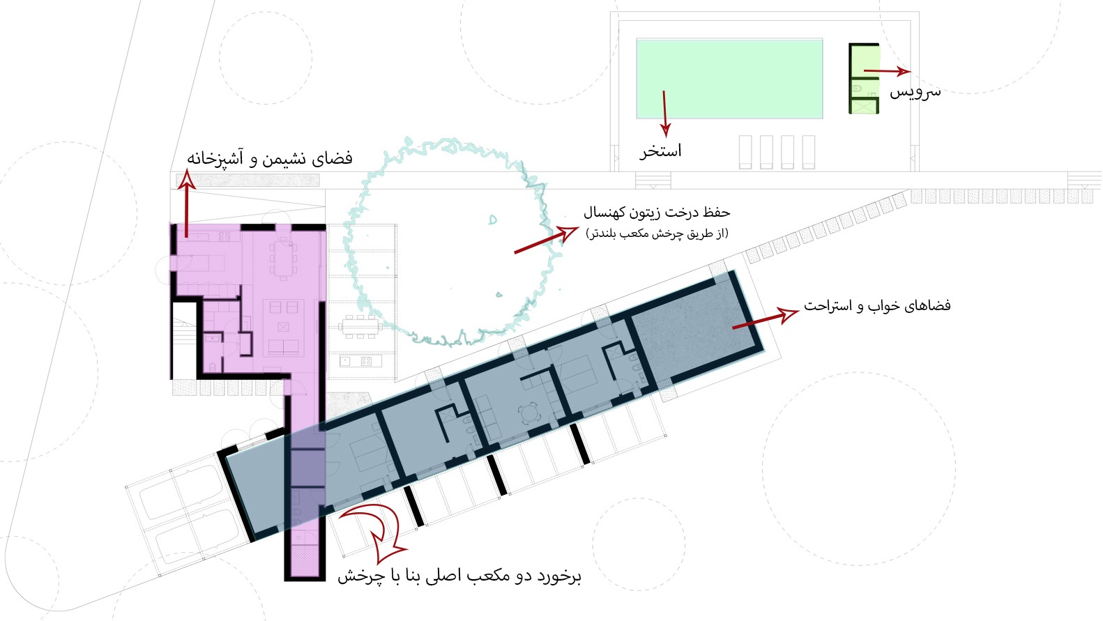 در زیر تحلیلی مختصر از پلان را مشاهده میکنید. این ویلا با نگاه تازهای که در برخورد با درختان داشته است میتواند نمونه موفقی باشد در راستای برخورد با ساختمانهای سازگار با محیط زیست و یا Eco-friendly. در واقع معمار این پروژه با چرخاندن دو مکعب قصد داشته با حفظ درختان سکانسی دیگر از محیط را در نظر بینندگان قرار دهد.